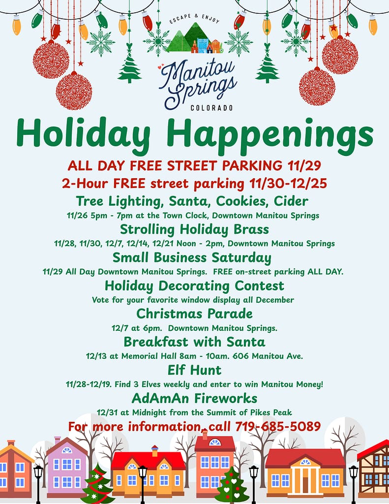 Spend your holiday season in Manitou Springs and enjoy all the wonderful Holiday Happenings: from strolling brass musicians, a holiday parade, finding elves around town, and meeting Santa Claus, to free parking, Manitou Springs offers a lot to families during the holiday season.