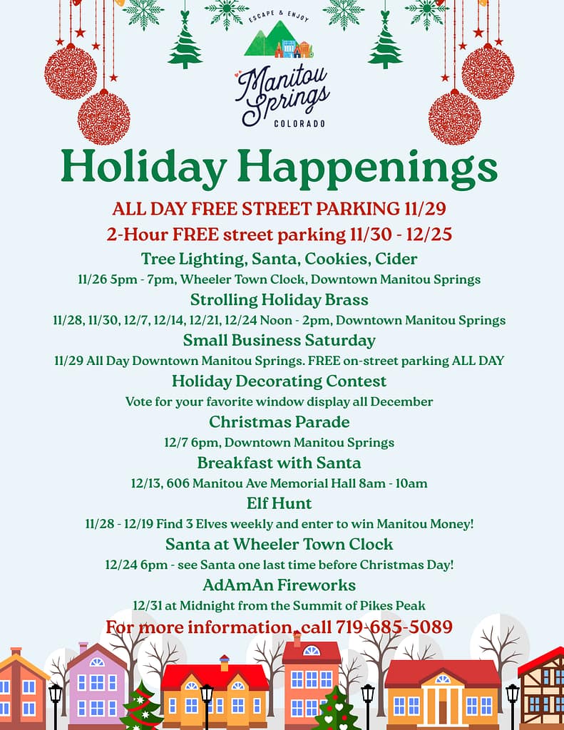 Spend your holiday season in Manitou Springs and enjoy all the wonderful Holiday Happenings: from strolling brass musicians, a holiday parade, finding elves around town, and meeting Santa Claus, to free parking, Manitou Springs offers a lot to families during the holiday season.